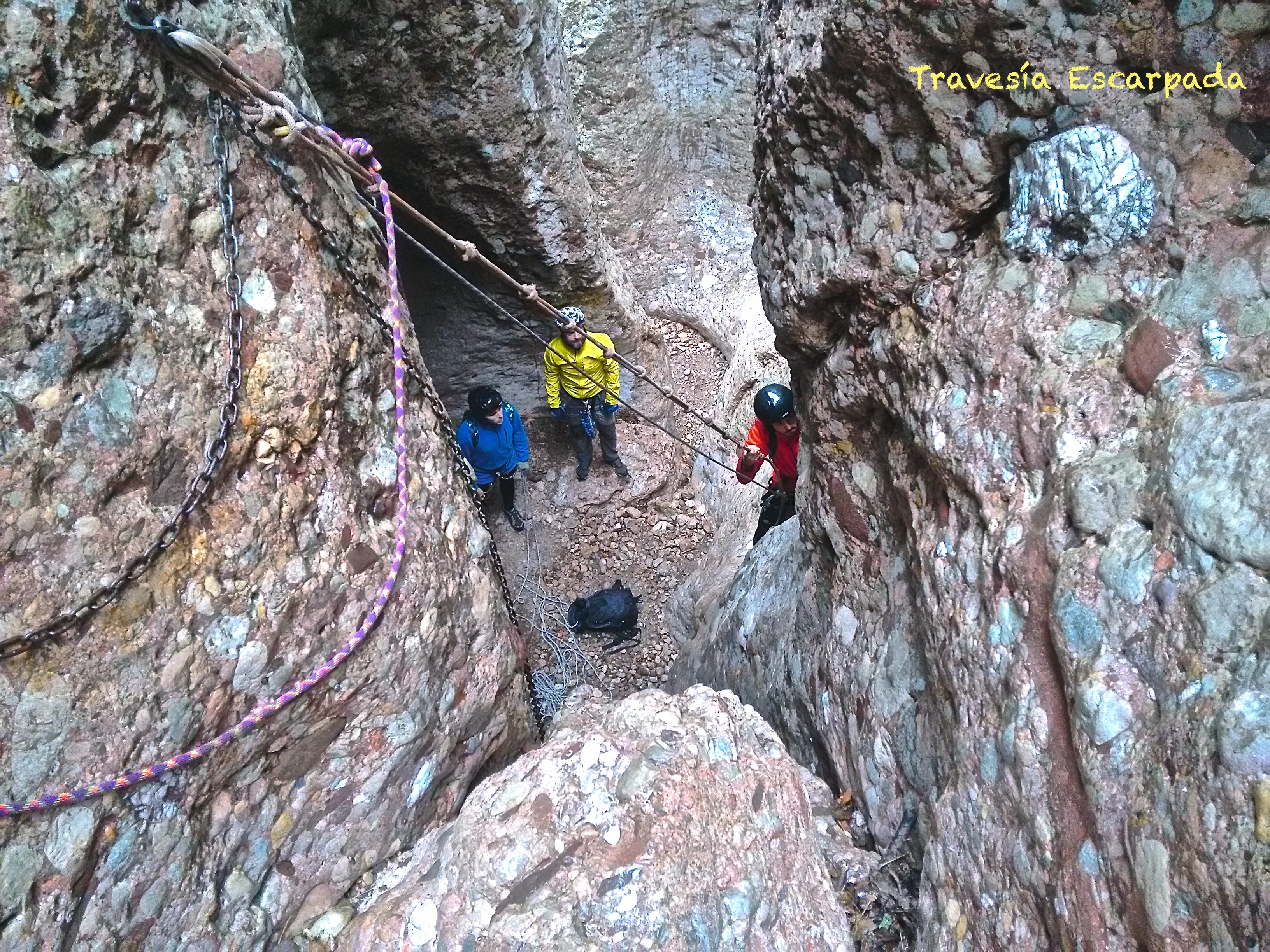 El tramo final, muy muy exigente chimenea «La OLLA«, donde no contamos con grapas, sólo con un cable en el cual nos apoyamos y avanzamos por oposición.